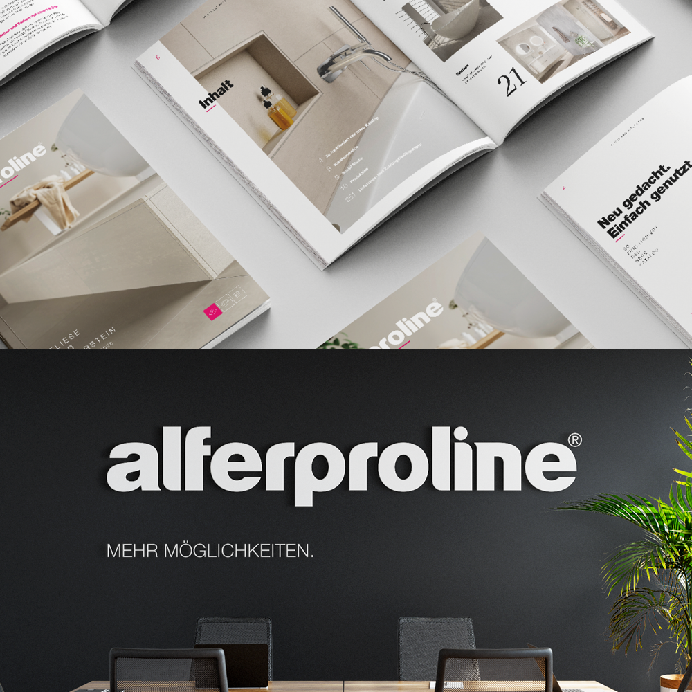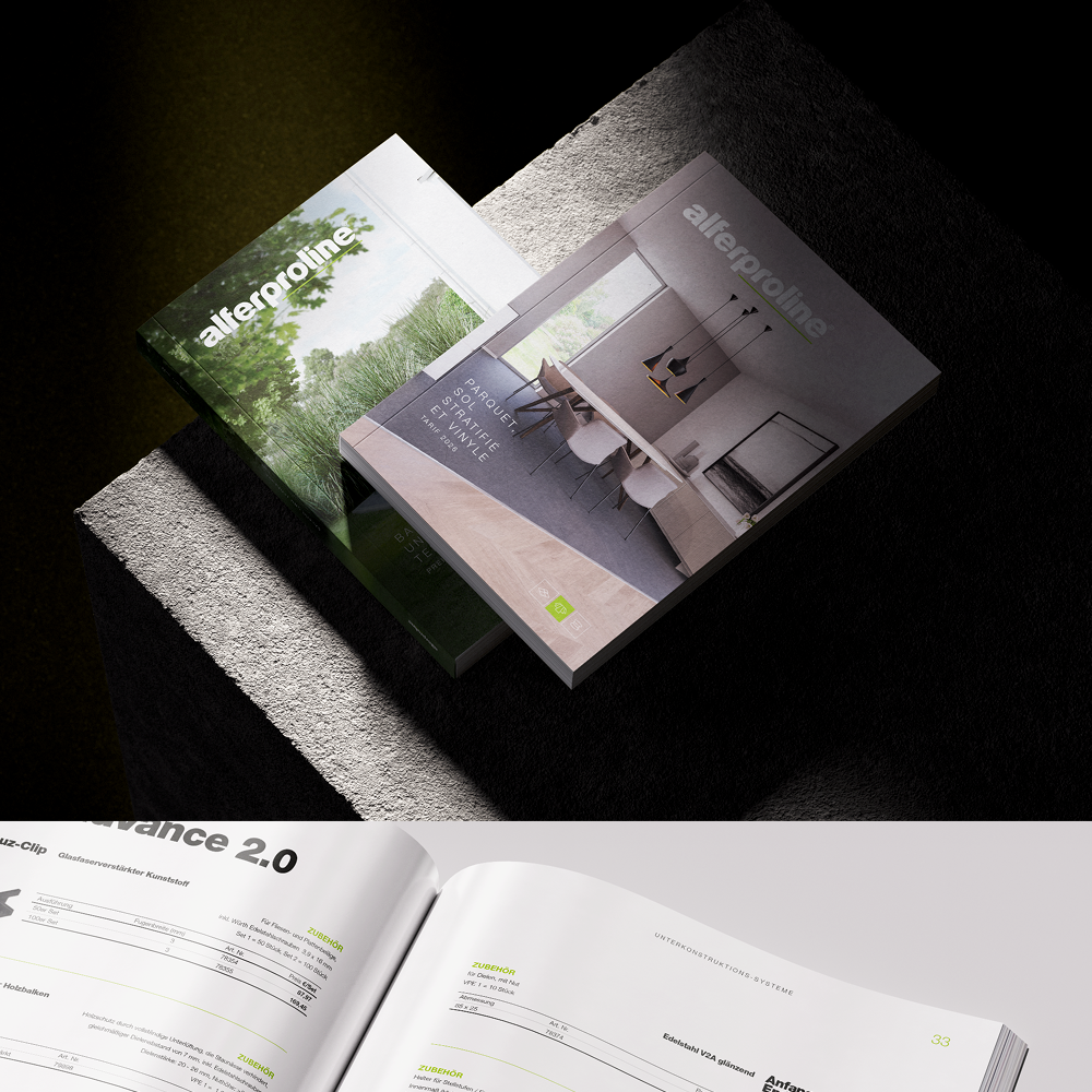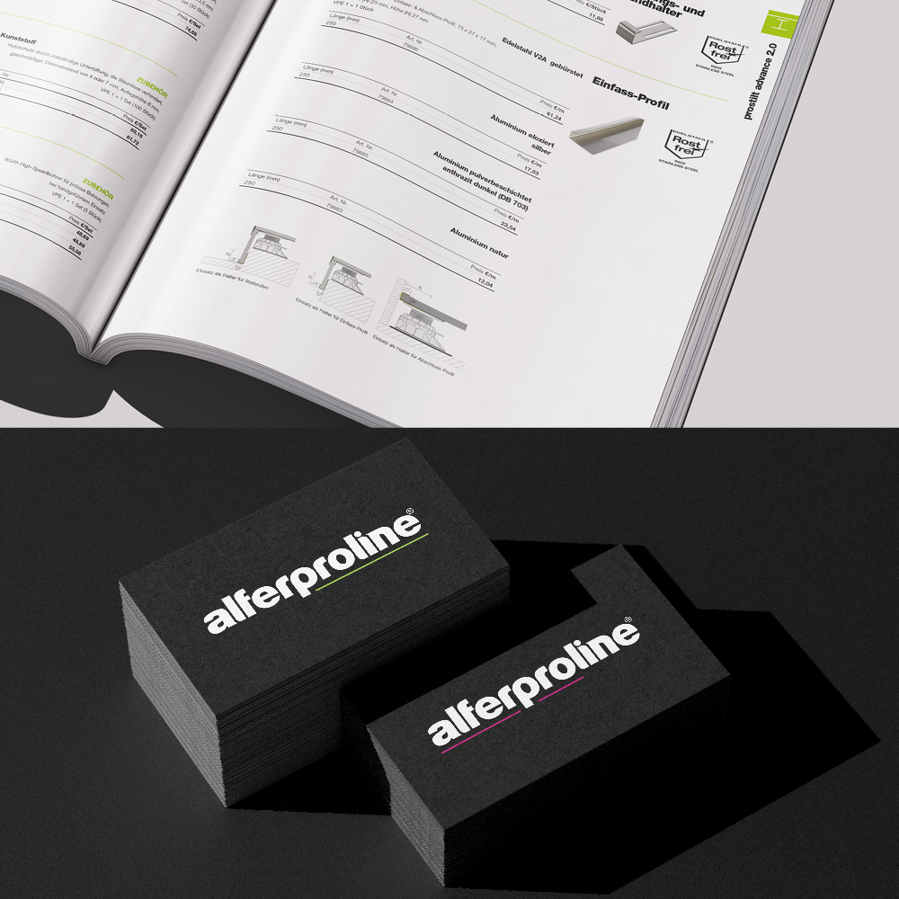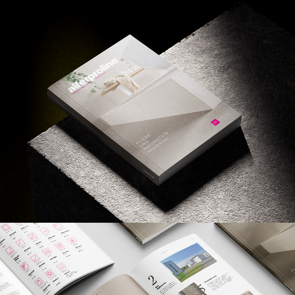 Alles ist im Fluss. Erst recht der Baustoffmarkt. Wer die Branche bewegen möchte, muss sich daher selbst bewegen – am besten nach vorn. Aus diesem Grund haben sich 2025 die beiden Profil-Anbieter alferpro® und Proline Systems zu alferproline® zusammengeschlossen und damit Know-how, Produktion und Logistik aus beiden Welten zu einem starken neuen Angebot vereint. Wir haben das neue Unternehmen vom ersten Tag an mit transparenter Merger-Kommunikation begleitet – von der Entwicklung des neuen Logos über Bewegtbild, plakative Messe-Visuals, Erklär-Broschüren, Produktmaterial, Präsentationen und Social-Media-Content bis hin zur Pressemeldung. Seit Anfang 2026 ist der Fusionsprozess erfolgreich abgeschlossen. Wir feiern ihn gemeinsam mit alferproline® mit drei frischen Produktkatalogen in jeweils drei Sprachfassungen: insgesamt 3.960 Seiten geballte Produkt-Informationen für Fliesenleger, Bodenleger und GaLaBauer, die keine Wünsche offenlassen.