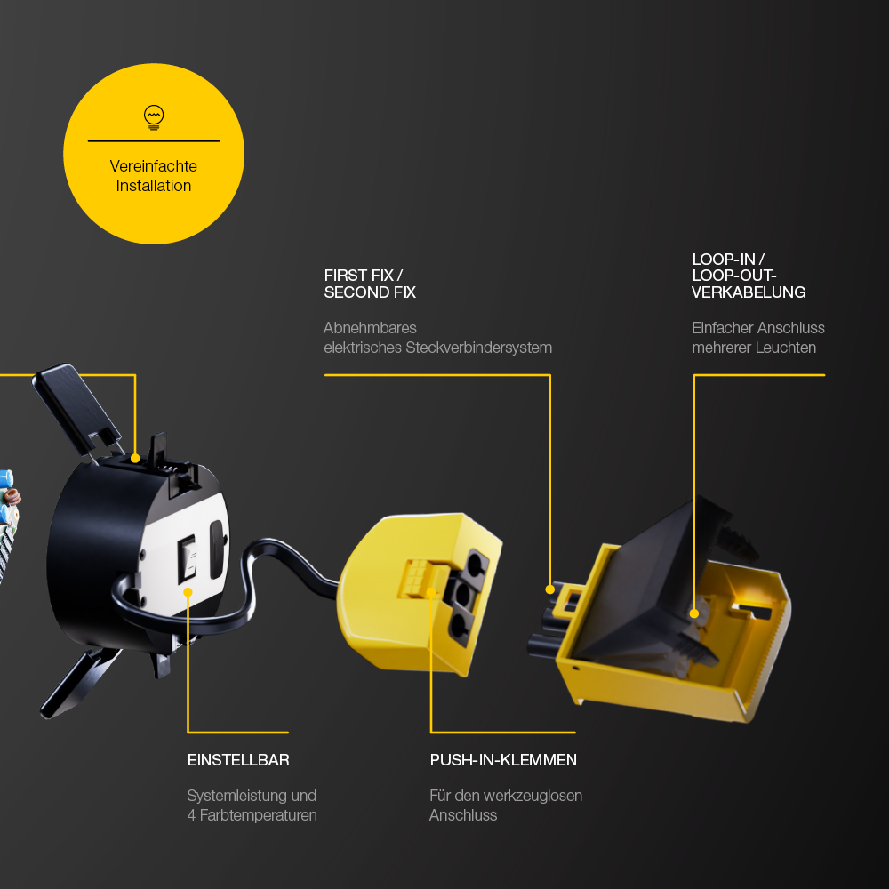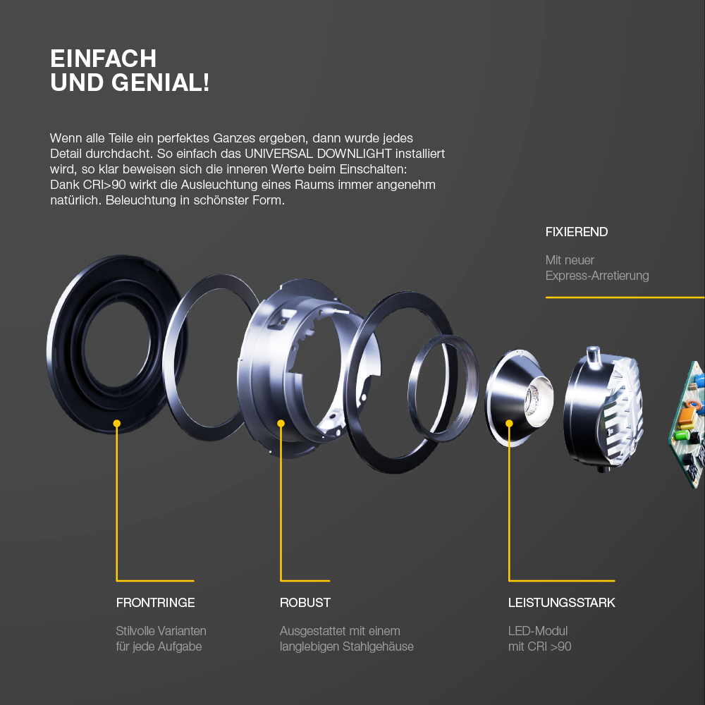 Das Schweizer Taschenmesser für Beleuchtungs-Aufgaben heißt Universal Downlight. Die schicke Einbauleuchte des Lichtgiganten SLV aus Übach-Palenberg trägt ihren Namen aus gutem Grund: Mit den zur Wahl stehenden Abdeckungen lässt sich einfach steuern, wie die Leuchte aussieht und ob sie starr, schwenkbar, staub- oder strahlwassergeschützt sein soll; sie lässt sich ohne Werkzeug installieren und unkompliziert an die Systemleistung und die gewünschte Farbtemperatur anpassen; sie sieht immer gut aus und integriert sich unauffällig in Außenbereiche, Wohn- und Arbeitsräume – der universelle Top-Tipp für alle Licht-Fachleute. Und das muss man erst mal wissen. Deshalb haben wir gemeinsam mit den 3D-Fachleuten von Lumos eine erhellende Produktbroschüre im Format 210 x 210 mm entwickelt. Sie stellt den Beleuchtungs-Tausendsassa in allen Facetten vor und ist dabei genauso schick, hilfreich und unkompliziert aufgebaut wie die Leuchte selbst. Einleuchtend.