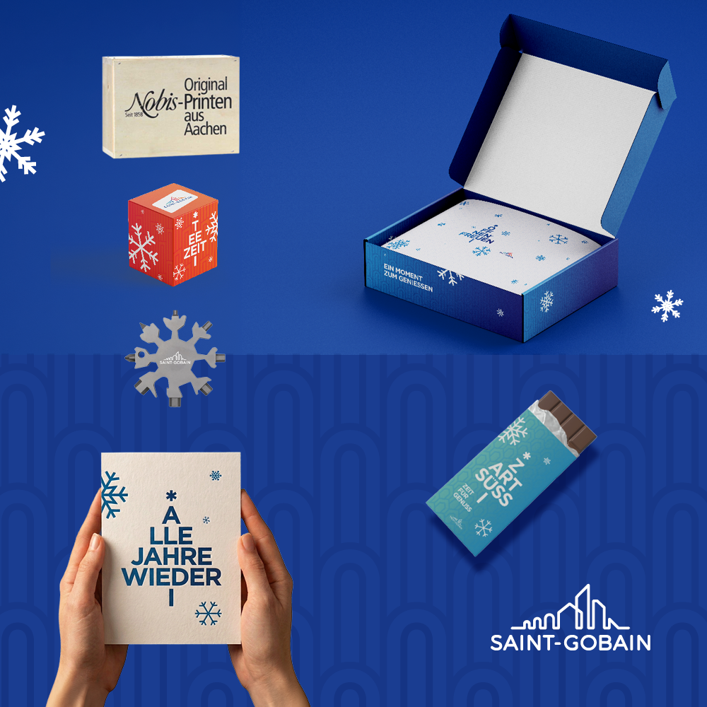 Der Flachglashersteller SAINT-GOBAIN GLASS bietet gemeinsam mit großen Veredlern ein breites Spektrum innovativer Hightech-Gläser – von Designglas über Isolierverglasungen bis hin zu Sicherheitsgläsern und Speziallösungen. Für Weihnachten 2025 haben wir für das Unternehmen Geschenkpakete entwickelt, die diese Vielfalt widerspiegeln: prall gefüllt mit Überraschungen für jeden Geschmack – vom Multitool in Schneeflockenform über edle Tee- und Schokoladenspezialitäten bis hin zur Printen-Box. Grußkarte, Versandbox, Seidenpapier und alle Inhalte haben wir dazu in eine klare, griffige Typo-Weihnachtsbaum-Optik gehüllt. Um sichtbar zu machen, dass wir in einer Welt voller Möglichkeiten den Blick fürs Wesentliche behalten sollten: dass es allen gut geht. Frohes Fest!